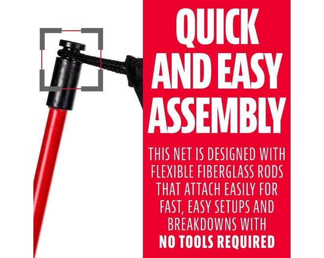 - QUICK AND EASY ASSEMBLY: This net is designed with flexible fiberglass rods that attach easily for fast, easy setups and breakdowns with no tools required